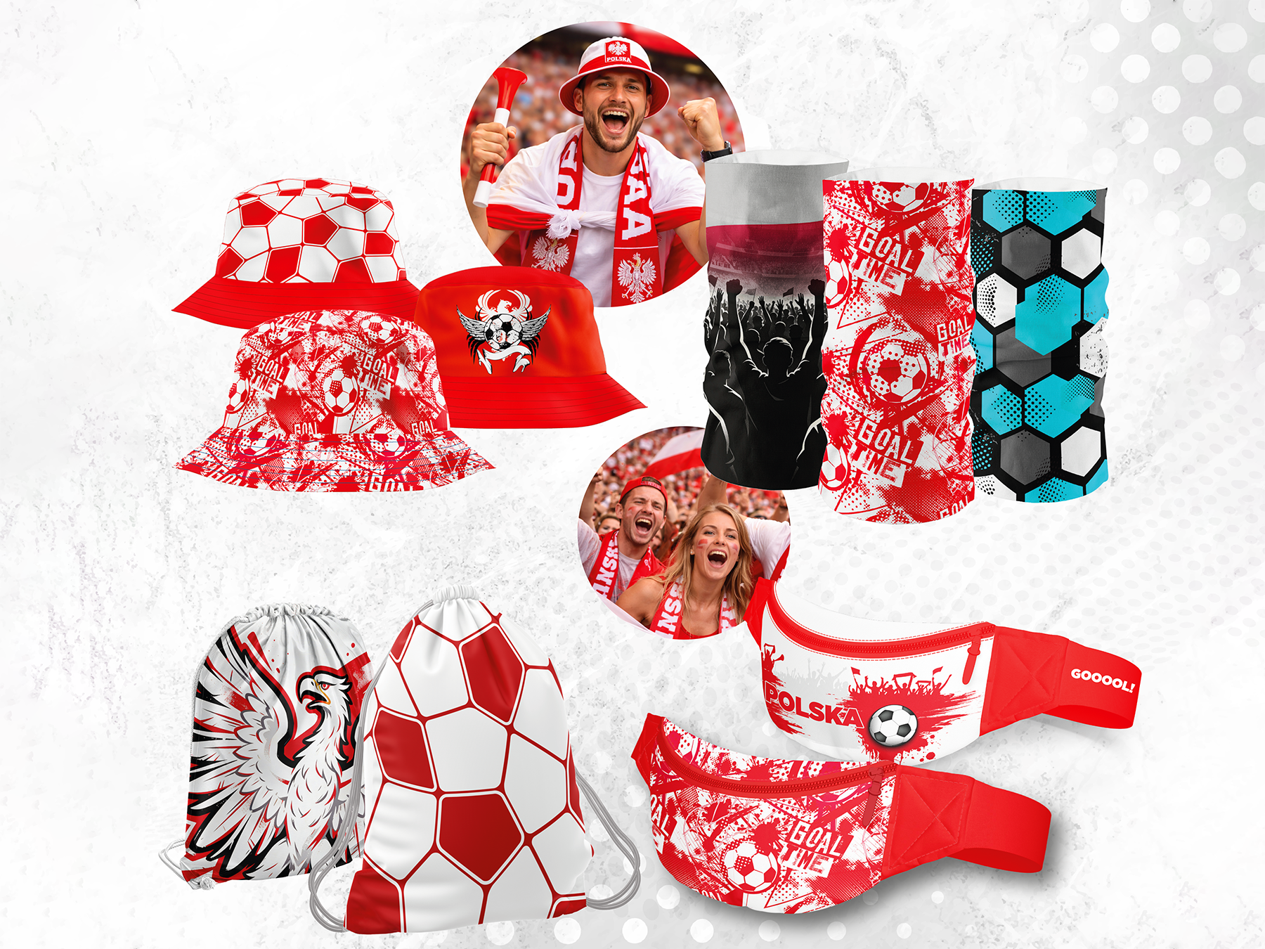 Praktyczne gadżety (czapki, bucket haty, worki, nerki), do których kibice wrzucą niezbędne rzeczy, dumnie nosząc logo Twojego klienta na mieście.